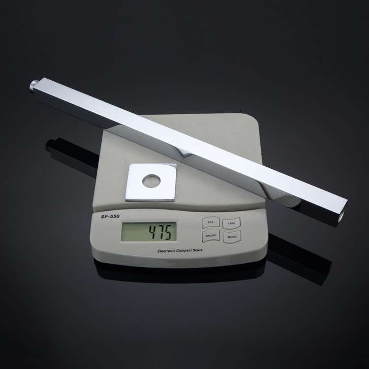The shower arm is manufactured from solid brass, as indicated by the measured weight of approximately 475 g for the 400 mm version shown. Solid brass density around 8.4–8.7 g/cm³ ensures high structural strength, enabling the arm to support large rain shower heads without deformation under static loads exceeding 5 kg.Precision Square Profile Dimensions