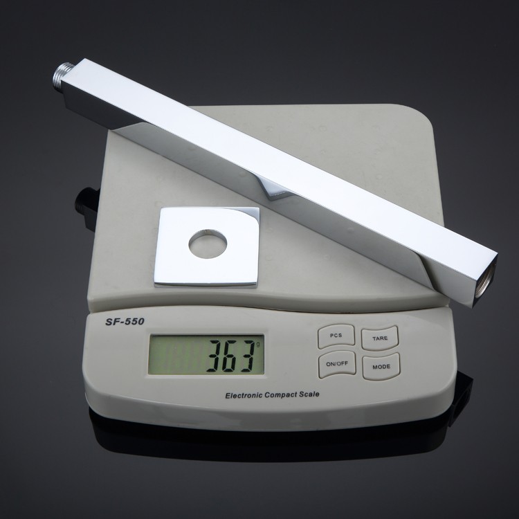 The shower arm is manufactured from solid metal with a measured weight around 300–310 g for a 350–400 mm length, indicating a dense internal structure. This mass distribution allows it to safely support large rain shower heads up to approximately 3–5 kg without visible deflection under static load, ensuring long-term positional stability.