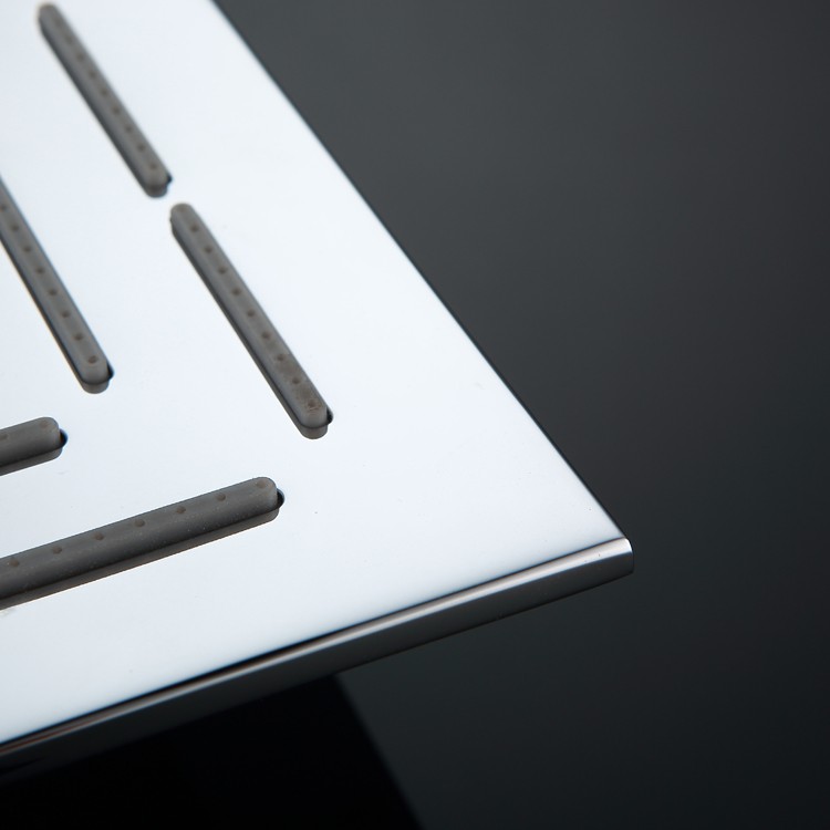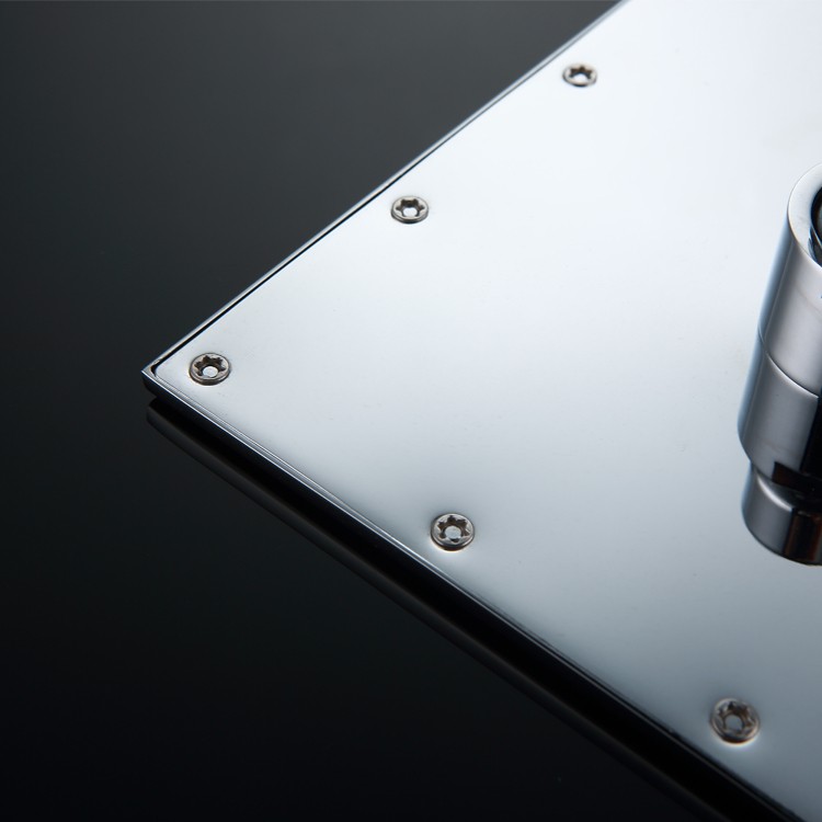 The Brass Ceiling Shower Head is a brass ceiling showerhead. Its square shape, approximately 8mm thick, features a silvery-white polish and a regular geometric arrangement of water outlets. Its elegant design combines functionality with aesthetics, making it a perfect fit for high-end modern bathroom spaces.