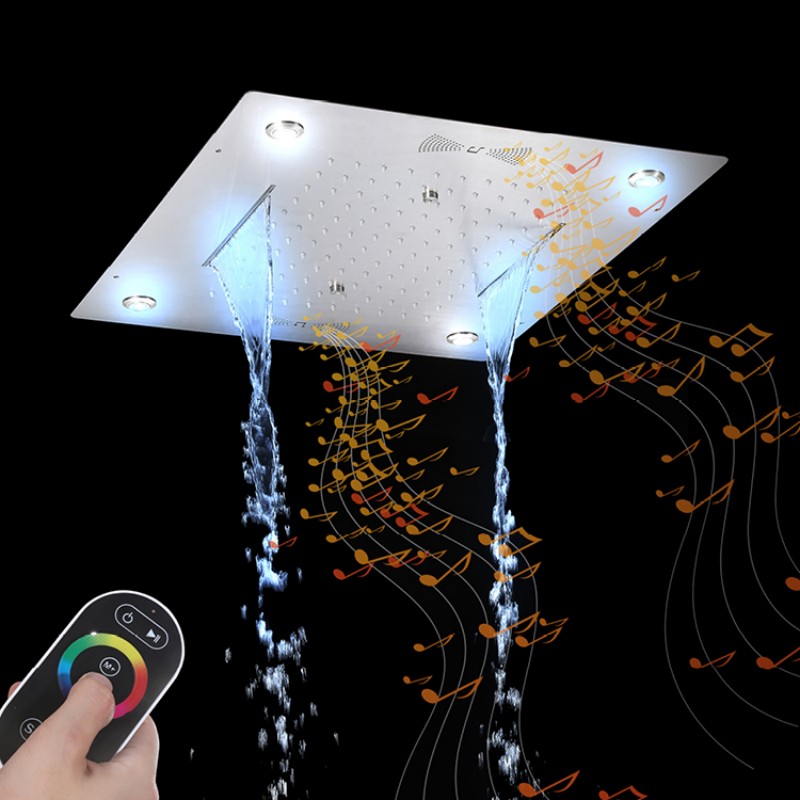 The Concealed Ceiling Shower Head measures 500 x 580 mm and is constructed entirely of SUS304 stainless steel. Its rectangular panel is concealed and ceiling-mounted. The evenly spaced water outlets combine rain, waterfall, and dual-atomizing jets, and are equipped with LED lighting and a music system, providing a multi-sensory experience during the shower.