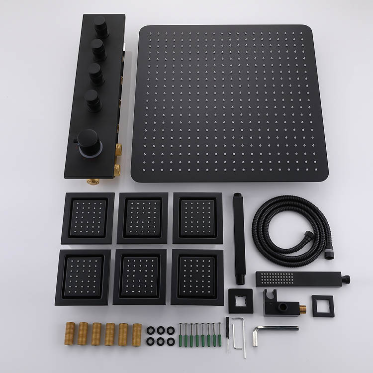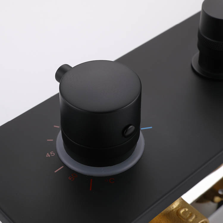 The Black Concealed Shower features a brass thermostatic valve cartridge with a temperature control range of 20–50°C and a 38°C safety lock. At a water pressure of 0.3MPa, the water temperature can be controlled to within ±1°C, effectively preventing hot and cold fluctuations. It is suitable for both home and high-end hotel use.