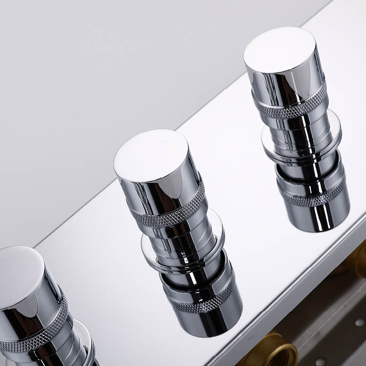 The Concealed Rain Shower features a high-precision thermostatic valve cartridge, enabling precise water temperature adjustment via an independent control panel. Regardless of fluctuations in hot and cold water pressure, the water temperature remains constant, eliminating the discomfort of fluctuating hot and cold water levels. The multi-knob control design allows users to easily switch between overhead, handheld, and massage sprays as needed, offering intuitive and convenient operation.