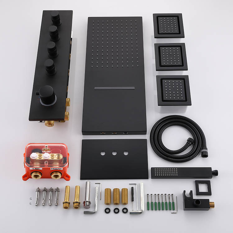 The Matt Black Concealed Shower is a high-end shower system with piping and valves completely concealed within the wall. The complete system includes a 500×500×2mm ultra-thin square showerhead with a 300mm overhead drain, six 130×130×8mm square side showerheads, a 220×35×15mm hand showerhead, a Ø14×1500mm anti-tangle hose, and a 550×120×12mm long panel with one master control knob and four sub-control knobs. It's ideal for modern, high-end bathroom spaces.