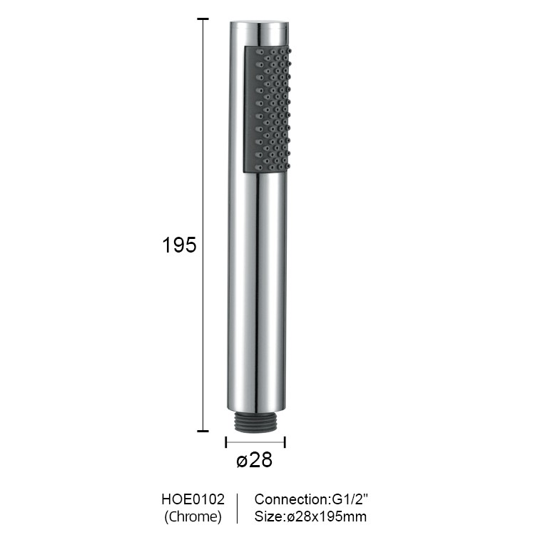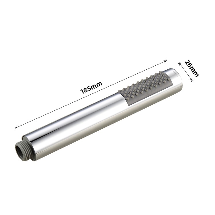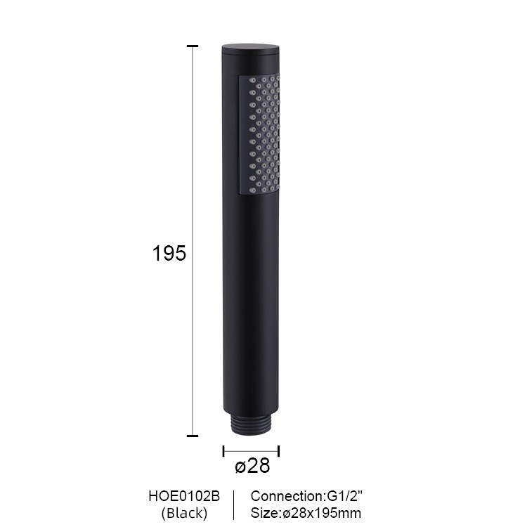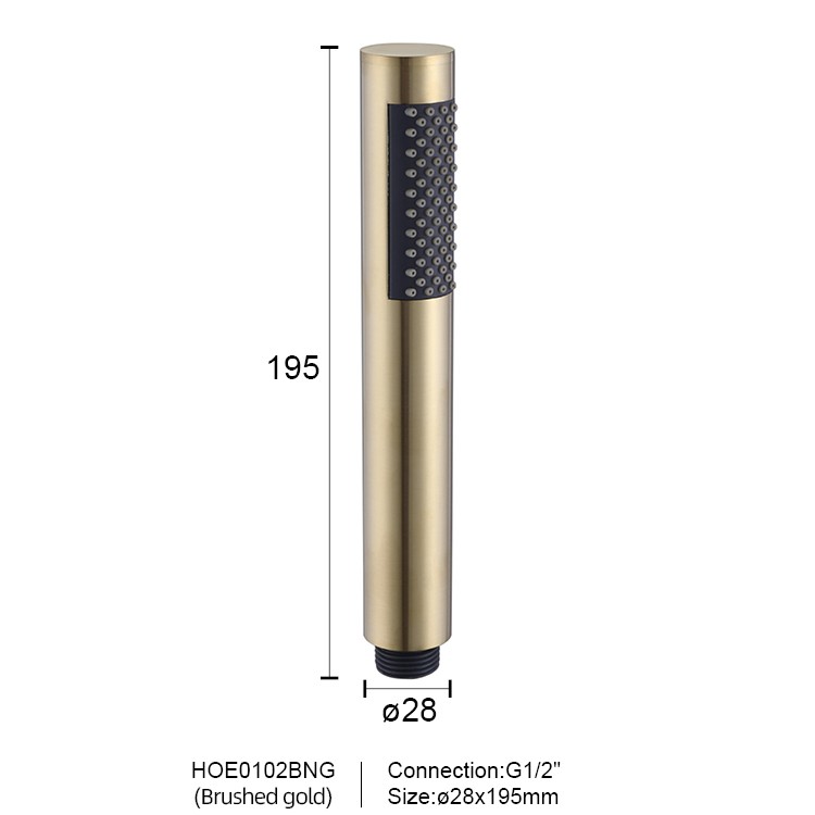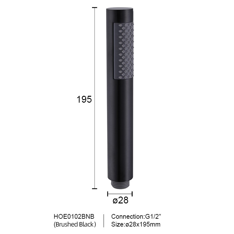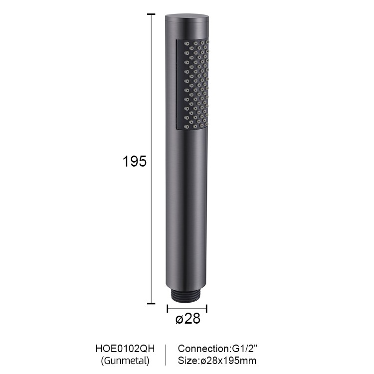 Shower Held is a wand-shaped hand shower designed for modern bathrooms. Its straight-tube design features a showerhead with a diameter of 28mm and a length of approximately 195mm, equipped with a G1/2" international standard connection. The housing is crafted from high-quality materials and features a variety of finishes, including glossy chrome, matte black, brushed black, brushed gold, and gunmetal gray, to suit any bathroom style. The nozzles are tightly arranged in flexible silicone, creating a slender and lightweight design that is both practical and enhances the modern feel and sophistication of any bathroom.